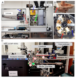 Laser-equipped gas reaction chamber for probing environmentally sensitive materials at near atomic scale