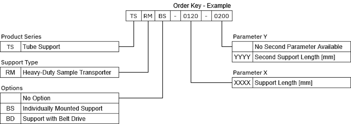 For both single- and dual-shaft heavy-duty sample transporters, the support type is RM.Options: