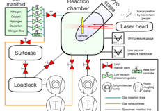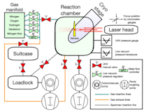 Laser-equipped gas reaction chamber for probing environmentally sensitive materials at near atomic scale